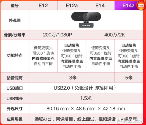 海康的下面几个都值得推荐,大家可以按需购买。本人购买的就是E12a,和e12比主要是多了一个自动聚焦,实际使用下来体验也不错。考研复试建议买自动对焦的,因为大概会有展示身份证的环节,这时候自动对焦就很方便。